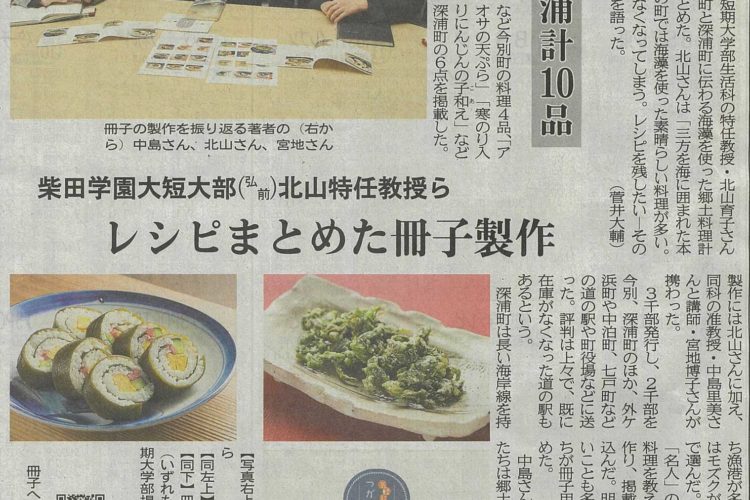 柴田学園大学短期大学部生活科の北山先生、中島先生、宮地先生が、今別町と深浦町に伝わる海藻を使った郷土料理のレシピを冊子にまとめたことが新聞に掲載されました。 「気軽に作って食べたいつがるの海藻料理」はこちら。 東奥日報 … 続きを読む