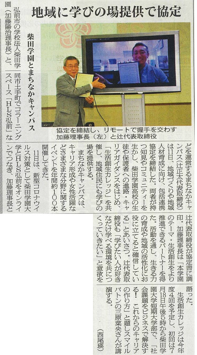 学校法人柴田学園(加藤陽治理事長)と株式会社まちなかキャンパス(辻正太代表取締役)の連携協定締結調印式が新聞に掲載されました。