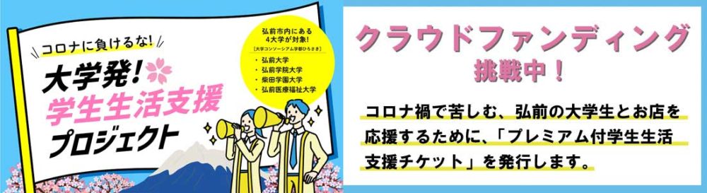 本学が所属する「大学コンソーシアム学都ひろさき」で、弘前の学生と商店の双方を支援するために、学生が 2,000円で購入できる 5,000円分の「プレミアム付学生生活支援チケット」 4,000人分を各大学の負担と弘前市の補助金を活用し発行することを決定しました。